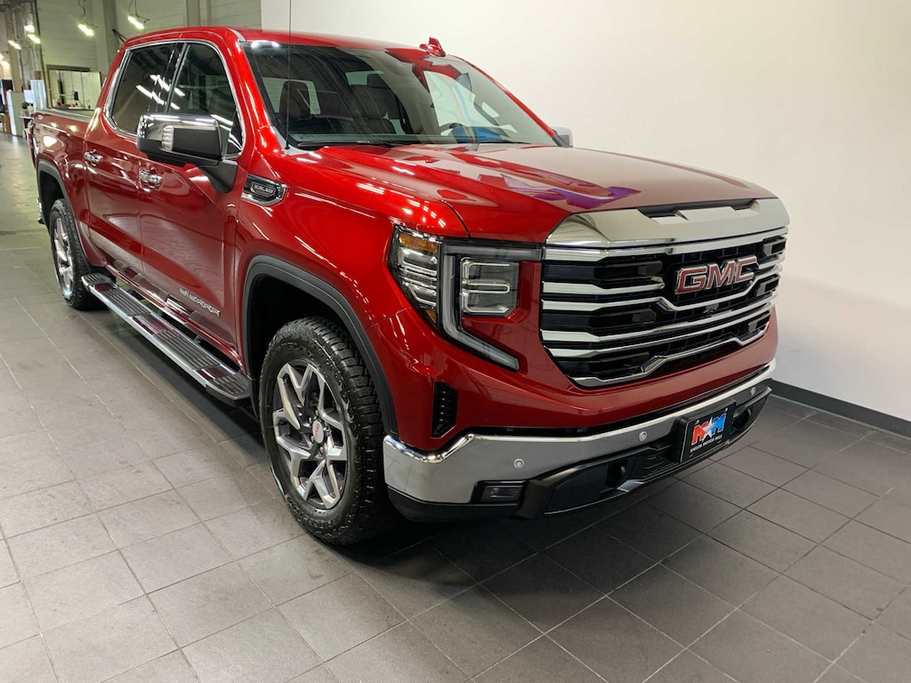 includes (PCY) SLT Convenience Package, (PDY) SLT Preferred Package, (PED) Sierra Safety Plus Package, (ZL6) ProGrade Trailering system, (NZD) 20 Polished aluminum wheels, (BVT) Chrome assist steps and (CGN) spray-on bedliner. includes (A50) bucket seats with (D07) center console, (KQV) ventilated front seats, (K4C) Wireless Charging, (UQA) Bose Premium Audio System, (N38) Power Rake/ Telescoping steering column and (UBC) USB ports, 2 (first row) Charge and Data ports located inside armrest, includes (X31) Off-Road Package, (CGN) spray-on bedliner and (RIA) All-weather floor liners, LPO Includes (NZD) 20 Polished aluminum wheels and (QAE) 275/60R20 all-terrain, blackwall tires. Includes (KSG) Adaptive Cruise Control, (A48) rear sliding power window, (UG1) Universal Home Remote and (KA6) heated second row outboard seats, includes (UD5) Front and Rear Park Assist, (UFB) Rear Cross Traffic Braking, (UKK) Rear Pedestrian Alert, (TRG) Trailer Camera Provisions, (UKV) Trailer Side Blind Zone Alert and (UV2) HD Surround Vision (Includes (HS1) Safety Alert Seat. Bluetooth® streaming audio for music and most phones; featuring wireless Android Auto® and Apple CarPlay® capability for compatible phones (STD), (355 hp [265 kW] @ 5600 rpm, 383 lb-ft of torque [518 Nm] @ 4100 rpm); featuring Dynamic Fuel Management (STD), with overdrive, and tow/haul mode and steering column paddle shifters. Includes Cruise Grade Braking and Powertrain Grade Braking. GMC SLT with Volcanic Red Tintcoat exterior and Dark Walnut/Slate interior features a 8 Cylinder Engine with 355 HP at 5600 RPM*.