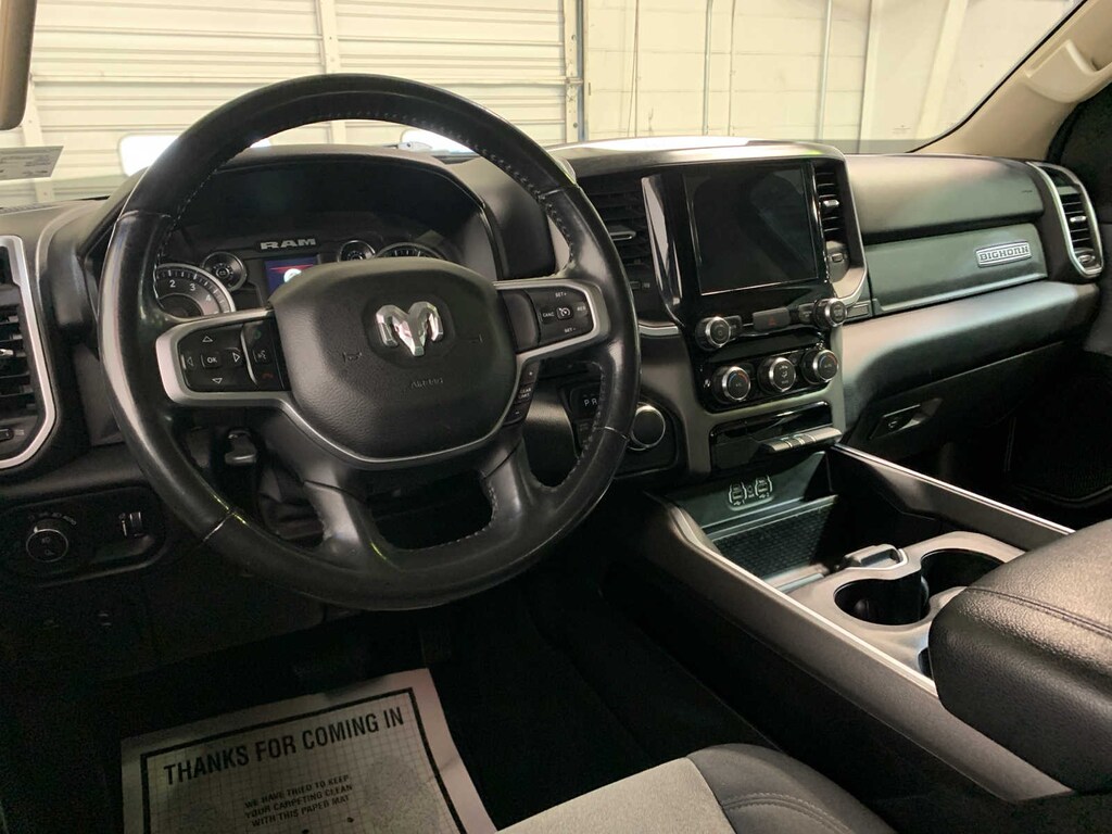 WHEELS: 20 X 9 ALUMINUM CHROME CLAD (WRK), Active Noise Control System, 180 Amp Alternator, Heavy Duty Engine Cooling, GVWR: 7,100 lbs, Dual Rear Exhaust w/Bright Tips, HEMI badge, 600W Engine Cooling Fan, 26 Gallon Fuel Tank, Radio: Uconnect 4 w/8.4 Display, SiriusXM Satellite Radio, Rear Window Defroster, Rear View Auto Dim Mirror, Power Adjustable Pedals, Rear Power Sliding Window, Rear Dome w/On/Off Switch Lamp, Glove Box Lamp, Power 4-Way Driver Lumbar Adjust, Power 8-Way Driver Seat, Universal Garage Door Opener, Cluster 3.5 TFT Color Display, Foam Bottle Insert (Door Trim Panel), Class IV Receiver Hitch, Black Premium Power Mirrors, Sun Visors w/Illuminated Vanity Mirrors, Big Horn IP Badge, Google Android Auto®, SiriusXM Traffic Plus, SiriusXM Satellite Radio, Disassociated Touchscreen Display, HD Radio, Integrated Center Stack Radio, For Details, Visit DriveUconnect.com, 1-Yr SiriusXM Guardian Trial, Air Conditioning ATC w/Dual Zone Control, GPS Navigation, SiriusXM Travel Link, 4G LTE Wi-Fi Hot Spot, 8.4 Touchscreen Display, Apple CarPlay®, Power 8-Way Driver Seat, Bucket Seats, Full Length Floor Console, Power 4-Way Driver Lumbar Adjust, TRANSMISSION: 8-SPEED AUTOMATIC (8HP75). Ram Big Horn with Granite Crystal Metallic Clearcoat exterior and Diesel Gray/Black interior features a 8 Cylinder Engine with 305 HP at 6400 RPM*. Local Trade-In Great Shape