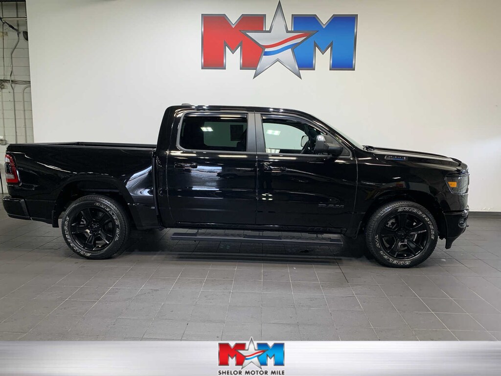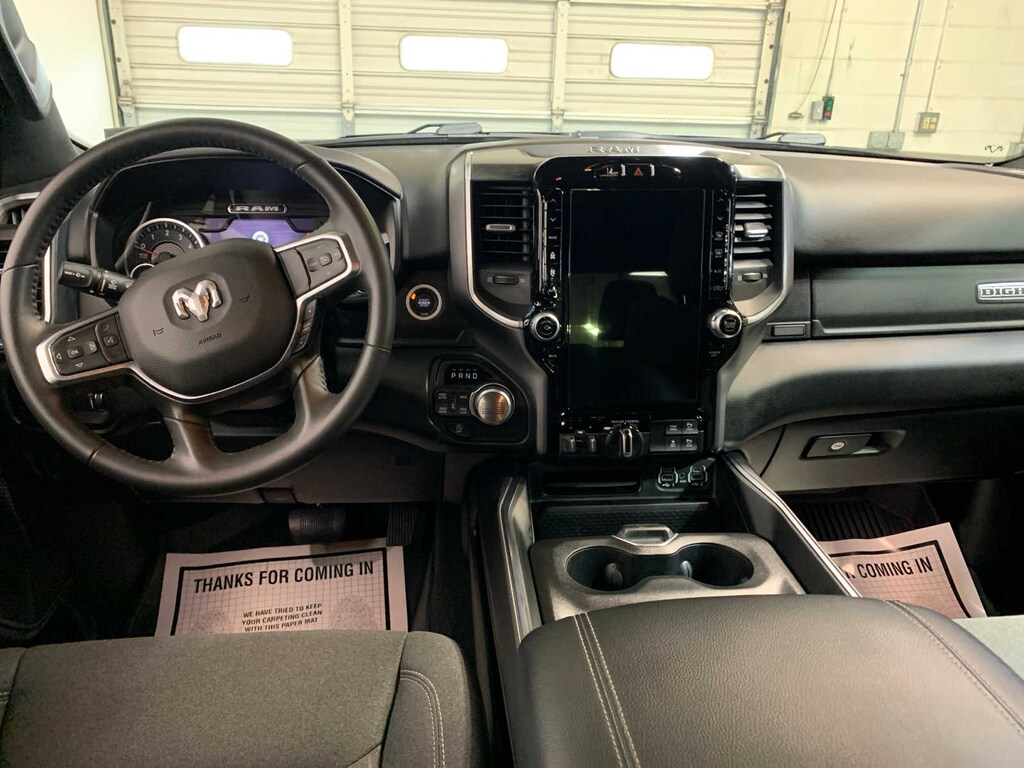 Rear Window Defroster, ParkSense Front/Rear Park Assist w/Stop, Rear View Auto Dim Mirror, Power Adjustable Pedals, Rear Power Sliding Window, Rear Dome w/On/Off Switch Lamp, Front Fog Lamps, Glove Box Lamp, Media Hub w/2 Charge Only USBs, Power 8-Way Driver Seat, Auto Dim Exterior Driver Mirror, Heated Front Seats, Heated Steering Wheel, Class IV Receiver Hitch, Security Alarm, Black Premium Power Mirrors, Big Horn IP Badge, Remote Start System, SiriusXM Satellite Radio, 400W Inverter, 9 Amplified Speakers w/Subwoofer, Radio: Uconnect 5 Nav w/12.0 Display, Google Android Auto®, SiriusXM Radio Service, USB Host Flip, HD Radio, For More Info, Call 800-643-2112, Connectivity - US/Canada, GPS Navigation, 4G LTE Wi-Fi Hot Spot, SiriusXM w/360L, All Radio Equipped Vehicles, Connected Travel &, Active Noise Control System, Heavy Duty Engine Cooling, Passive Tuned Mass Damper, Dual Rear Exhaust w/Bright Tips, HEMI Badge, 23 Gallon Fuel Tank, 18 Aluminum Spare Wheel, Tires: 275/55R20 OWL All Season, Accent Color Premium Power Mirrors, Exterior Mirrors w/Supplemental Signals, Black Headlamp Bezels, Exterior Mirrors Courtesy Lamps, Auto Dim Exterior Driver Mirror, Black Exterior Truck Badging, Anti-Spin Differential Rear Axle, Wheels: 20 x 9.0 Premium Paint/Polished, Accent Color Door Handles, Grille Surround 1 Black Texture 2 Black, Black Interior Accents, Dual Exhaust w/Black Tips, Power-Folding Mirrors, Body Color Front Bumper, Body Color Rear Bumper w/Step Pads, RAM Grille Badge - Black, Black Painted Exterior Mirrors Caps, Advanced Brake Assist, Pedestrian Emergency Braking, Full Speed Forward Collision Warning Plus, Lane Keep Assist, LED Taillamps, Transfer Case Skid Plate, Steering Gear Skid Plate, Front Suspension Skid Plate, Fuel Tank Skid Plate, Tow Hooks, TRANSMISSION: 8-SPEED AUTOMATIC (8HP75), Power 8-Way Driver Seat, Bucket Seats, Manual Adjust 4-Way Front Passenger Seat, Full Length Floor Console, Rear Center Armrest, Power 2-Way Driver Lumbar Adjust. Ram Big Horn with Diamond Black Crystal Pearlcoat exterior and Black interior features a 8 Cylinder Engine with 395 HP at 5600 RPM*. Serviced here, Originally bought here, Local Trade-In