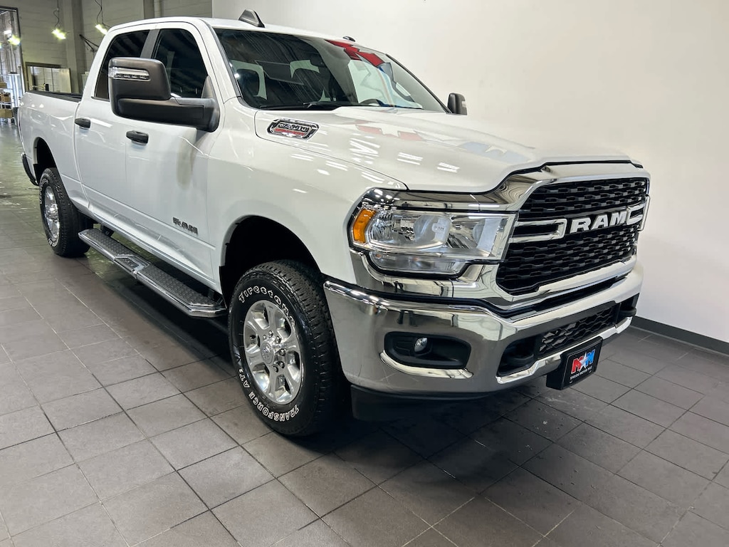 Storage Tray, Rear 60/40 Folding Seat, Front Armrest w/Cupholders, Remote USB Port - Charge Only, Front Center Seat Cushion Storage, Manual Adjust 4-Way Front Passenger Seat, Power Adjust 8-Way Driver Seat, Front Seat Back Map Pockets, Power 2-Way Driver Lumbar Adjust, CHROME FLAT CAB-LENGTH SIDE STEPS, Google Android Auto®, For Details, Visit DriveUconnect.com, For More Info, Call 800-643-2112, Leather Wrapped Steering Wheel, Rear Dome w/On/Off Switch Lamp, Front Fog Lamps, Glove Box Lamp, Auto Power-Folding Mirrors, Footwell Courtesy Lamp, 4G LTE Wi-Fi Hot Spot, Mirror Running Lights, Radio: Uconnect 5 W w/8.4 Display, 8.4 Touchscreen Display, Foam Bottle Insert (Door Trim Panel), Wheels: 18 x 8.0 Polished Aluminum, Apple CarPlay®, Big Horn IP Badge, Power Adjustable Convex Aux Mirrors, Forward & Reverse Utility Lights, Locking Lower Glove Box, Selectable Tire Fill Alert, SiriusXM Satellite Radio, Power Heated Fold Telescope Mirrors, Exterior Mirrors w/Supplemental Signals, Steering Wheel Mounted Audio Controls, Exterior Mirrors Courtesy Lamps, Dual Glove Boxes, 2nd Row In Floor, (STD), (STD). Ram Big Horn with Bright White Clearcoat exterior and Diesel Gray/Black interior features a 8 Cylinder Engine with 410 HP at 5600 RPM*. AutoCheck One Owner Nice